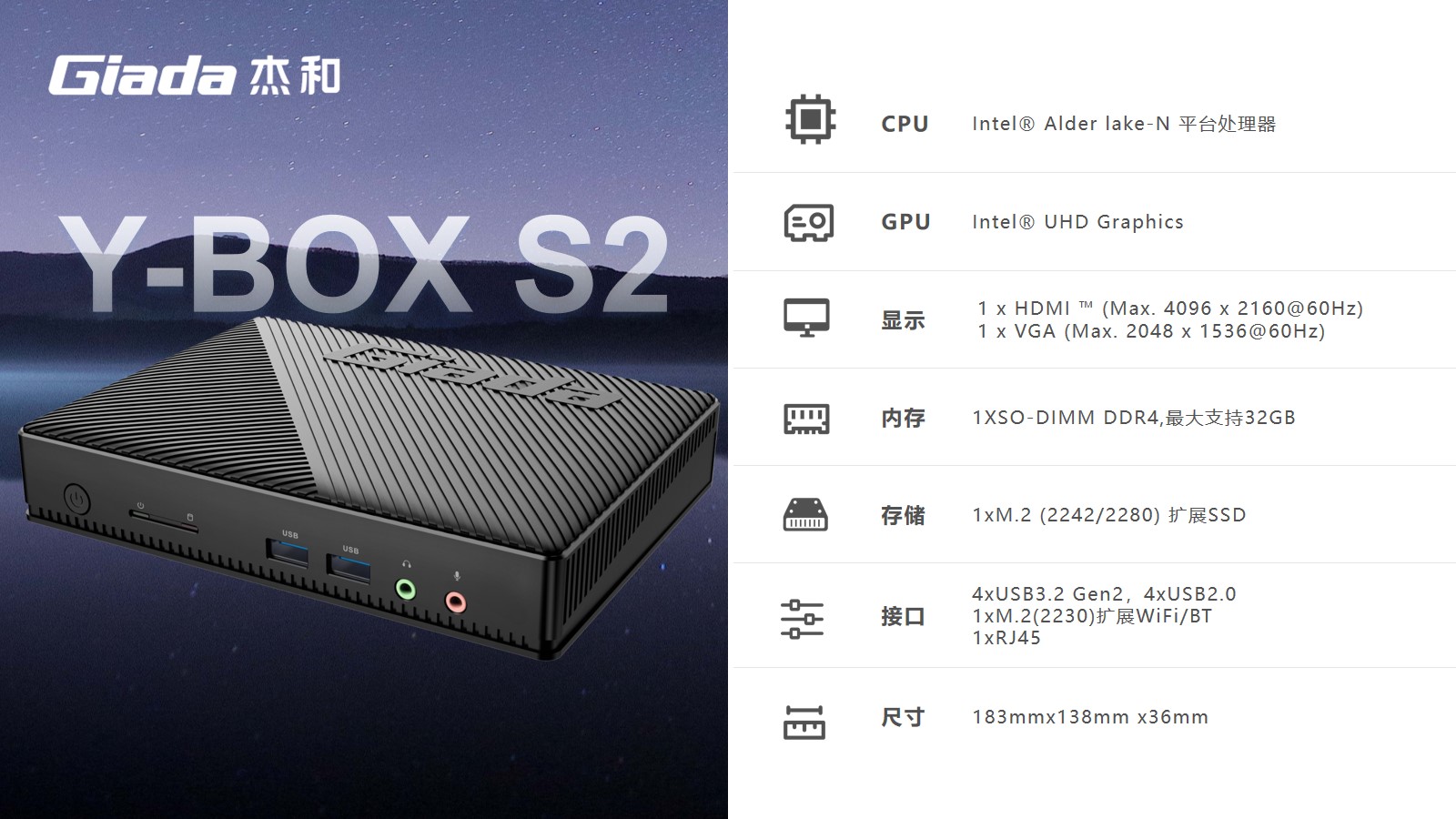 Y-BOX S2处理器平台为Alder Lake-N,是英特尔首款采用7纳米制程的产品系列。采用主流的DDR4内存,支持 M.2和eMMC多存储设备可选,M.2支持PCIE X2和SATA SSD,可满足客户对高数据读写的需求,最大支持32GB;具备一个HDMI接口和一个VGA接口,可以连接到显示器、电视及投影仪,HDMI接口支持最高分辨率为4096 x 2160@60Hz,VGA接口支持最高分辨率为2048 x 1536@60Hz。