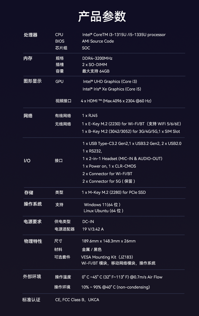 k8凯发科技D613采用英特尔Raptor Lake酷睿i3-1315U/i5-1335U 处理器,作为一款性能强悍的主机,它的TDP仅15W,能有效降低能耗,延长电池寿命。在内存方面,D613采用2 x SO-DIMM DDR4-3200 MHz,最大可达64GB,并配备1 x M-Key M.2 (2280) for PCIe SSD。