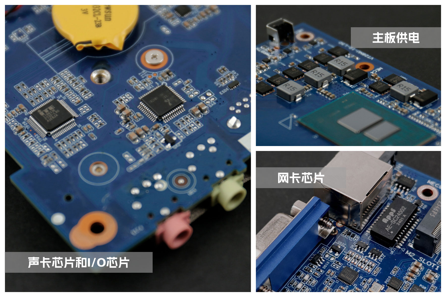 k8凯发桌面云终端Y-BOX S2主板采用的是3+1相供电,在主板两侧的接口附近,都分布了相关的芯片。在千兆网口附近有1个网卡芯片RTL 8111H,在主板背面的音频接口附近可以看到一个经典的“小螃蟹”ALC897 声卡芯片,声卡芯片附近有一个I/0 芯片HE8613E-LX。