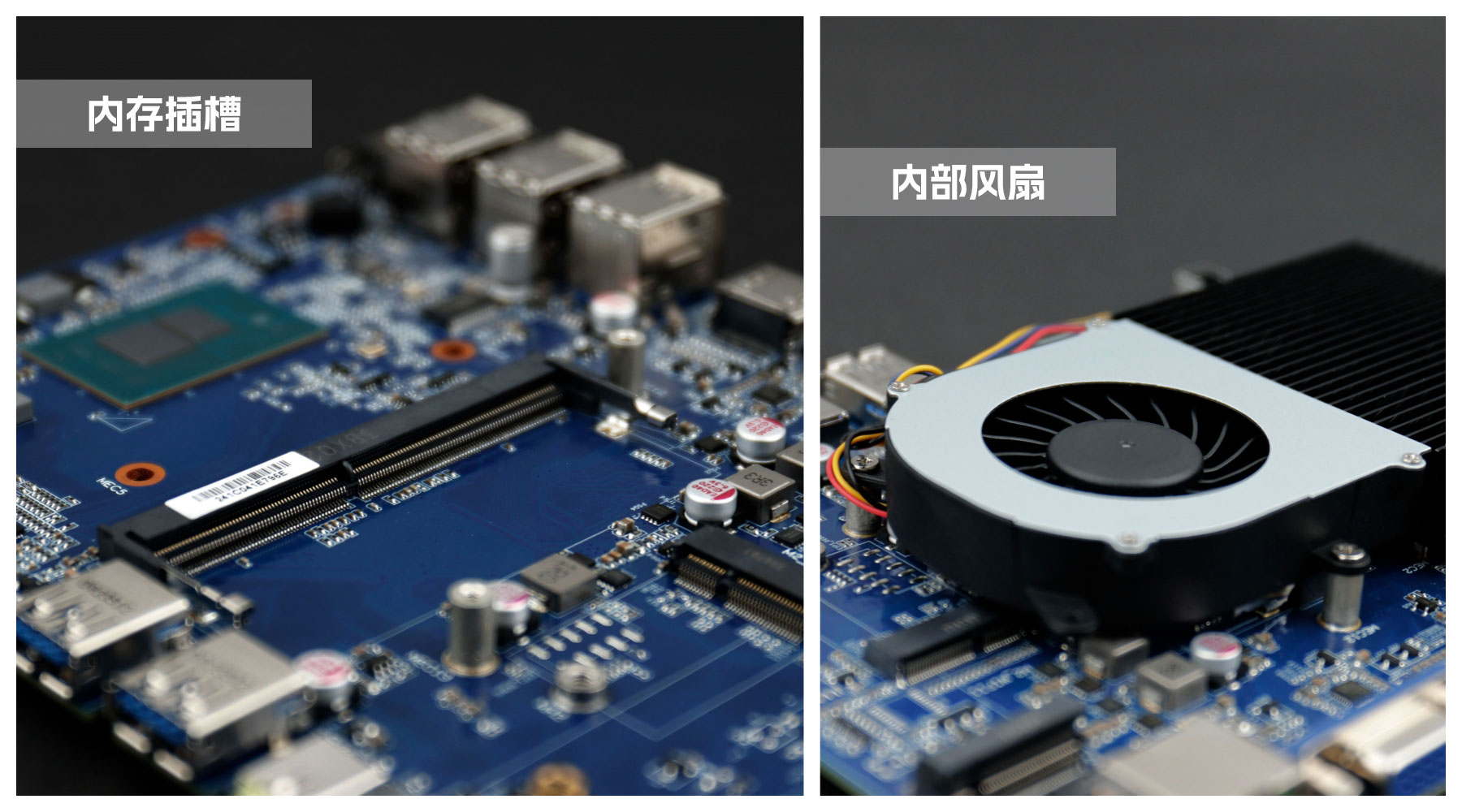 k8凯发桌面云终端Y-BOX S2主板中部是内存插槽,采用单通道笔记本内存槽设计,最大支持容量可达32GB,最高支持DDR4-3200MHz频率,横插的形式可以减少主板的占用体积,使整体机身更紧凑,内存顶部的风扇起到高效散热的作用。