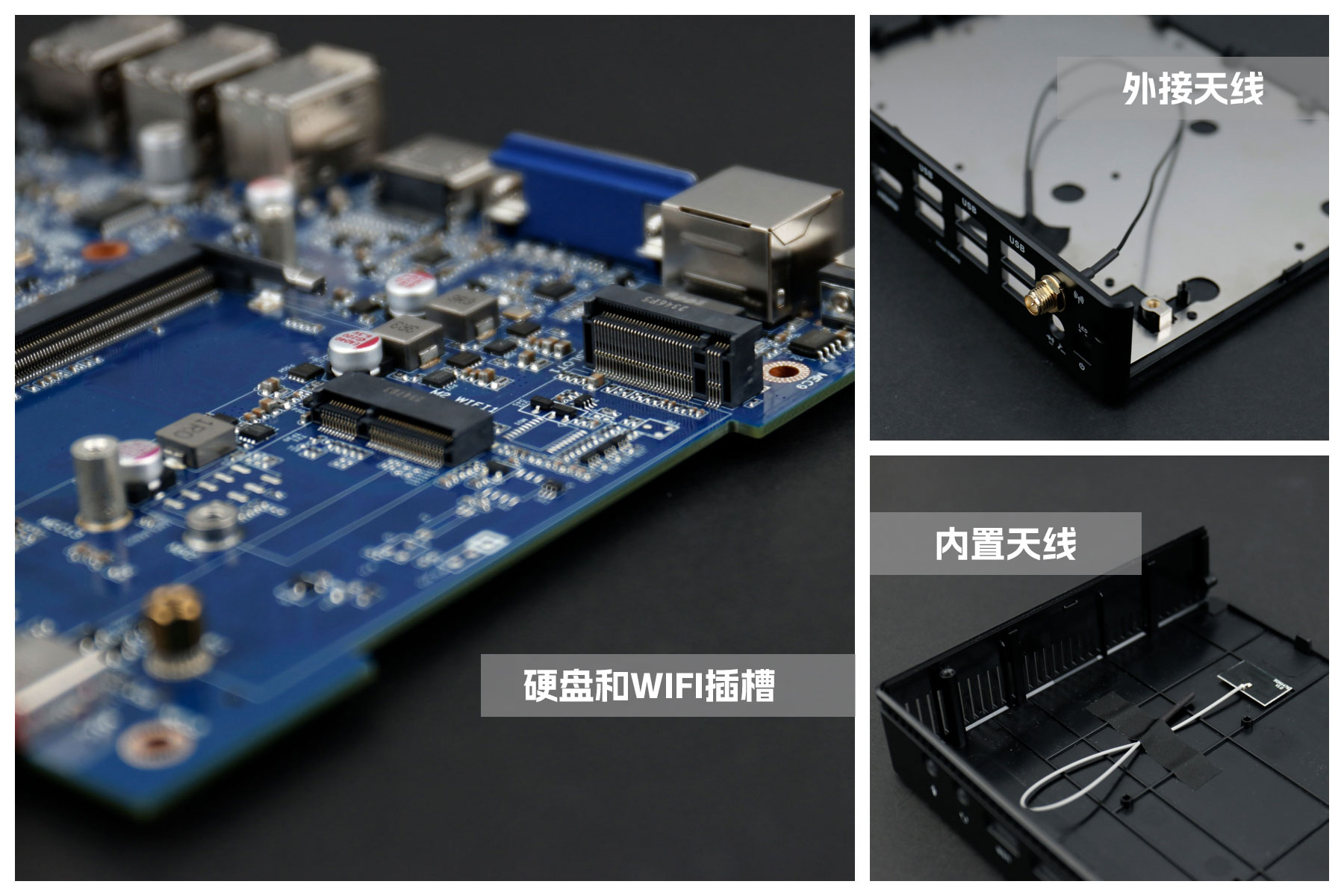 k8凯发桌面云终端Y-BOX S2主板上配备了 1个 M.2 固态硬盘位,接口规格为 PCIe3.0 标准,匹配标准的 2280 规格硬盘。一侧还有一个M.2接口,匹配2230长度的WIFI/BT模块插槽,WiFi模块可以连接的是外接天线,增强信号,同时也可以内接天线,灵活应用,支持Wi-Fi 5/6/6E网络。