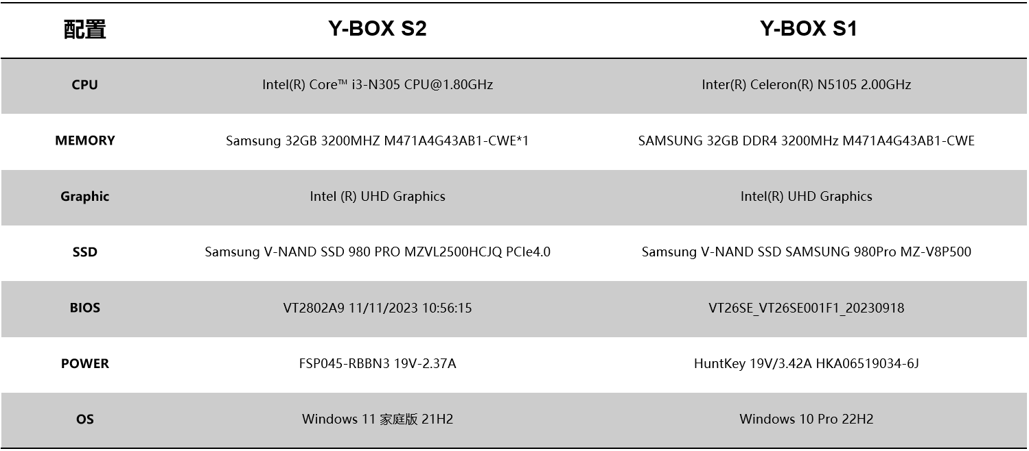 针对桌面云终端Y-BOX S2的测试项目中,最值得关注的是性能测试的跑分数据和稳定性测试内容,这能直观影响主机在使用过程中的稳定性和用户的使用体验。针对性能测试,k8凯发选择了将Y-BOX S2与前一款更迭产品Y-BOX S1进行对比分析,Y-BOX S2支持Intel® Alder lake-N处理器,Y-BOX S1支持Intel® Jasper Lake,并分别选取了以下配置: