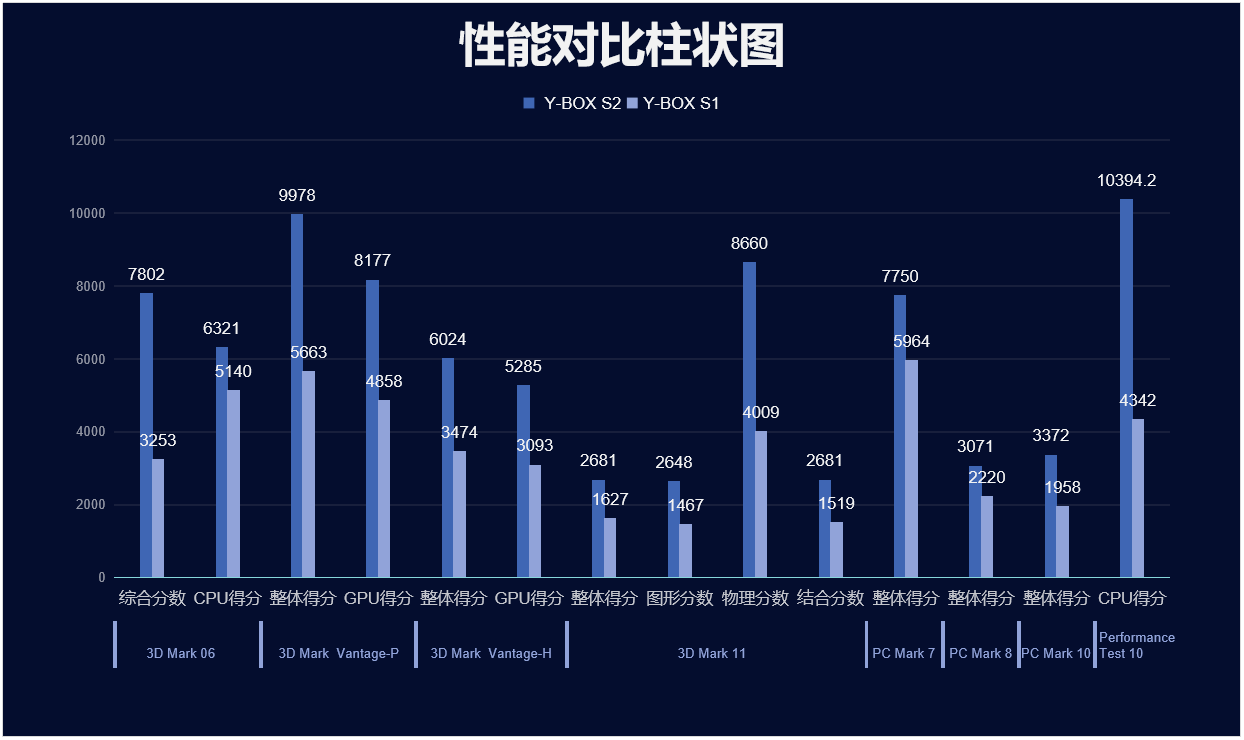 k8凯发来具体看看各个测试项目的跑分情况,测试项目包括显示性能测试、系统性能测试、CPU性能测试,分别用3D Mark、PC Mark以及Performance 10等系列不同软件的跑分数据,针对两款主板的跑分情况可以看出,k8凯发桌面云终端Y-BOX S2的数据在各项性能上都得到了大幅度提升,柱状图能更直观地体现出数据的变化,k8凯发将针对具体的几项数据来进行详细分析。