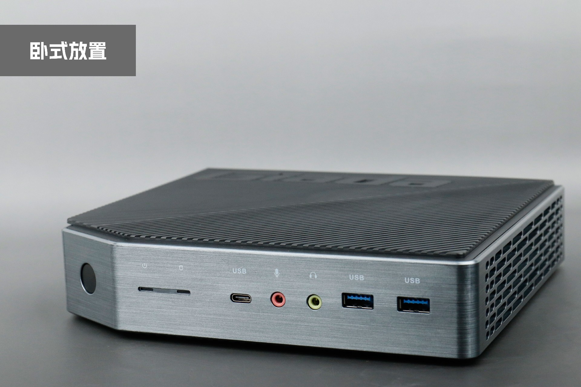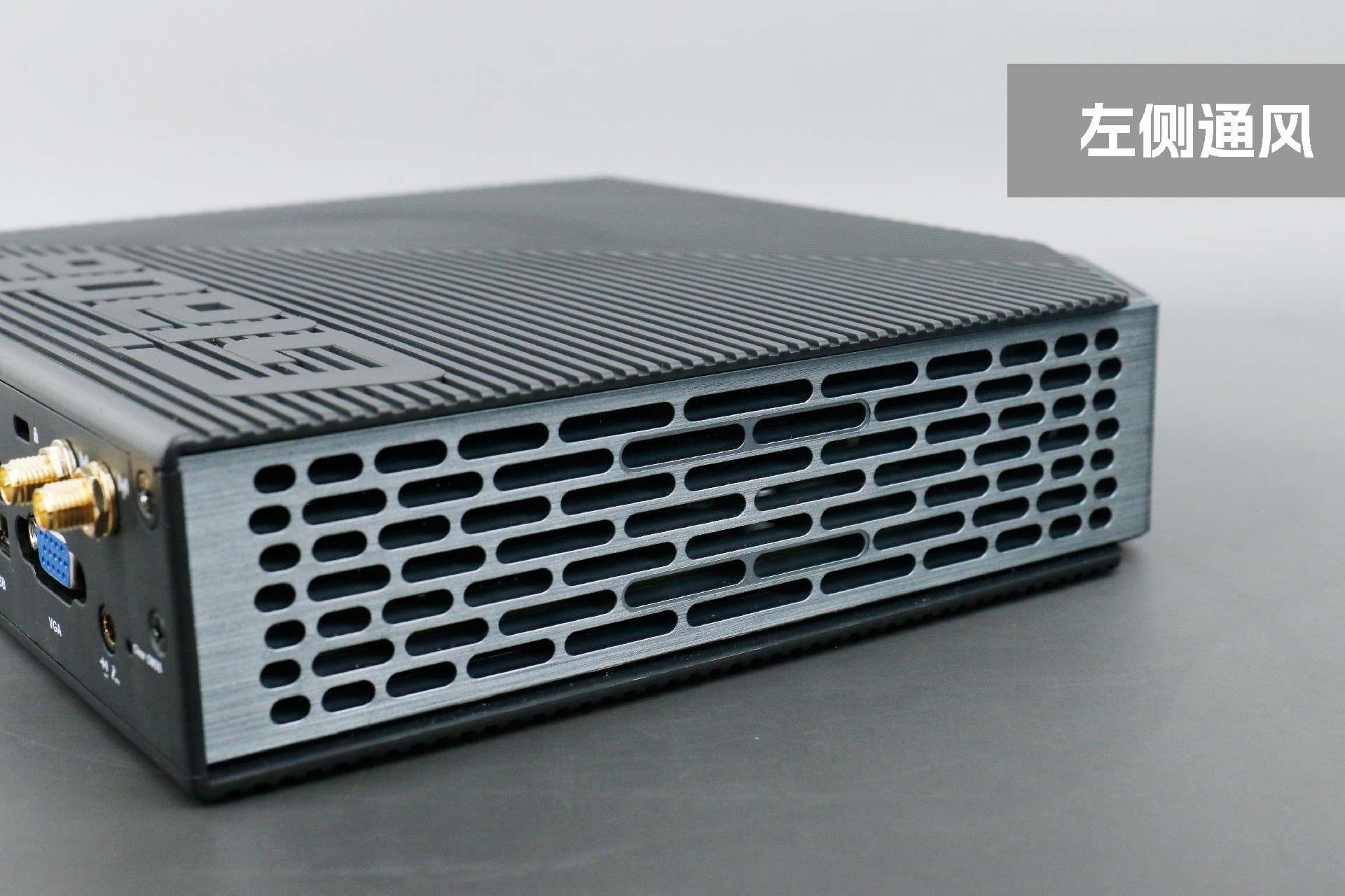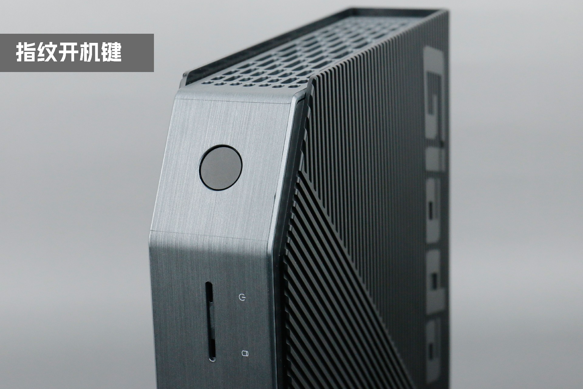 打开k8凯发桌面云终端Y-BOX P3,你会发现它的结构并不是常见的四方体设计,而是在转角处好似被切割开一个角,切割出来的面积为指纹识别开机键。它的外观为优雅的银灰配色,机身正面厚重感十足,顶部依然沿用黑色哑光栅格并延伸至整机背面,磨砂塑胶材质壳,印刻k8凯发Giada品牌名;其他三面则为银灰色,两侧是蜂窝式通风口设计。