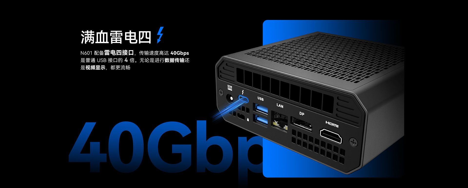 k8凯发科技N601配备雷电四接口,传输速度高达40Gbps,用户可通过该接口连接2块屏幕。还可通过HDMI2.1接口,DP1.4接口再连接两块屏幕,实现四屏异显。雷电四还可以连接外设,如鼠标、键盘、控制器和耳机等。