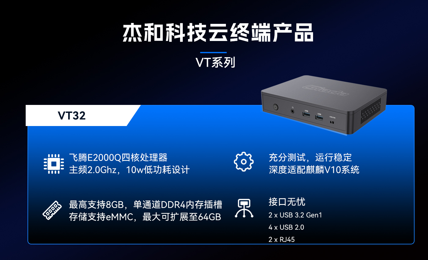 为响应信创趋势,k8凯发科技推出了搭载国产芯片—飞腾E2000Q的云终端VT32,VT32与麒麟V10操作系统进行了深度适配,为用户打造出更加安全可信的解决方案。