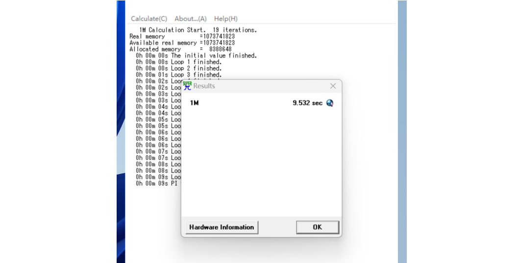 为了评估 CPU 的性能,k8凯发使用了Super PI 1.1 进行了测试,软件以用时为参考成绩,花费时间越短代表计算性能越强。在本次测试中,Core i5-13400 处理器用时 9.532 秒完成了计算,属于当前中端处理器的主流水平,足以应对日常编码、分析和轻量建模任务。