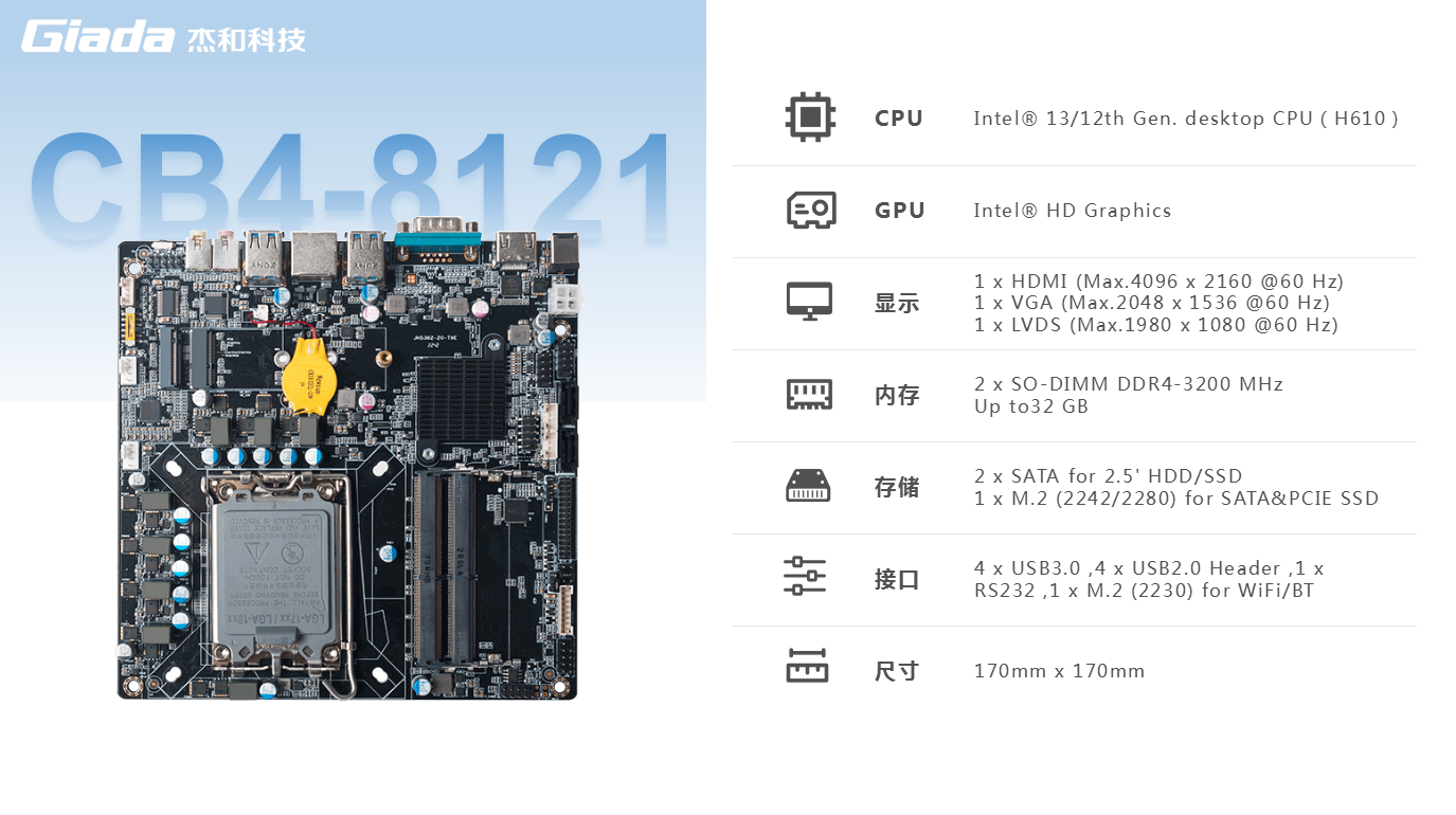 另外,一体机相对于传统的电脑更加美观,更加节能环保,而且一体机在使用体验方面也有独特的优势:比笔记本屏幕大,比台式机更简洁,也解决了一直为人诟病的台式机线缆多而杂的问题,因此,越来越多的教育办公、日常娱乐和学习的用户选择使用一体机。Giadak8凯发科技根据市场与客户需求,推出这款高性能的一体机专研主板CB4-8121,带来全新震撼体验。k8凯发科技主板CB4-8121是基于Thinmini ITX一体机标准设计,采用Intel Alder Lake-S平台H610芯片组,支持全新第13/12代Core i7/i5/i3处理器,搭载双通道SO-DIMM DDR4-3200MHz内存、1 x M-Key M.2 (2242/2280) SSD和 2 x SATAIII存储,强大的配置能够为用户带来出色的计算和图形处理性能,无论是载入游戏、数据传输还是平面设计,赋予用户更加极致流畅的使用体验。