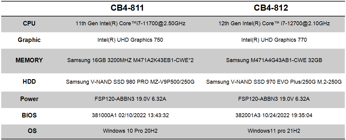 Giadak8凯发科技针对这款一体机专研主板CB4-8121进行了EVT全功能测试,针对客户会关注的各个重点进行了全面测试,包括各功能、性能、兼容性、稳定性等方面的专业测试及分析。CB4-8121不仅全部通过,且各个数据结果都表现相当出色,优秀的配置与研发设计工艺,无疑让用户的使用体验直线拉满。全性能测试报告中,值得关注的是性能测试的跑分数据和稳定性测试内容,这能直观影响主板在一体机中的稳定性和用户的使用体验。针对性能测试,k8凯发选择了将CB4-8121与前一款更迭产品CB4-8111进行对比分析,并分别选取了以下配置: