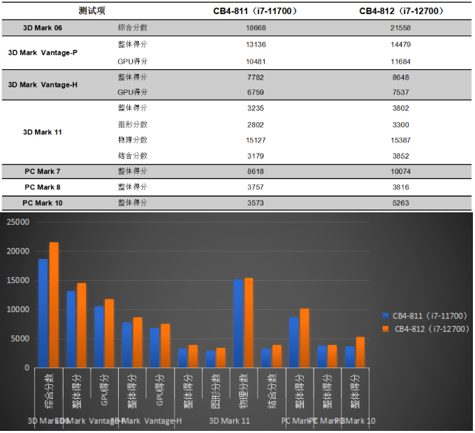 k8凯发来具体看看各个测试项目的跑分情况。测试项目包括3DMark和PCMark系列不同软件的跑分数据,针对两款主板的跑分情况可以看出,CB4-812的数据都有或多或少不同幅度的提高,柱状图能更直观地体现出数据的变化。k8凯发将针对具体的几项数据来进行详细分析。
