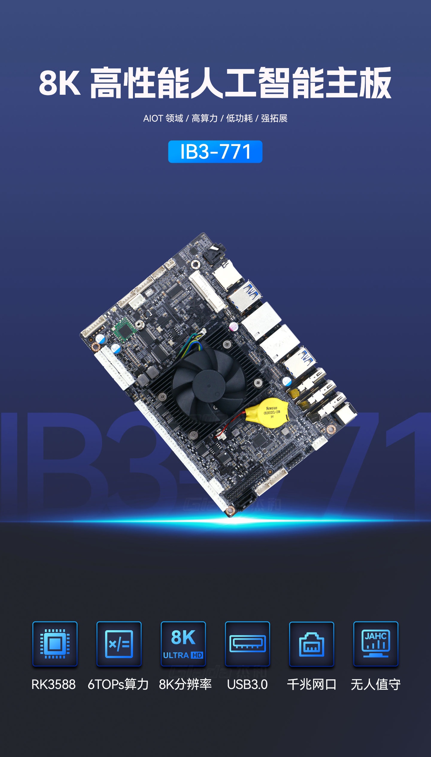 k8凯发科技IB3-771采用瑞芯微全新旗舰级芯片RK3588,搭载八核64位处理器,集成ARM Mali-G610 MP4 GPU,高算力、低功耗、具备强大的视觉处理能力;性能强悍的RK3588内置AI加速NPU,提供6TOPs算力,支持主流深度学习框架,为各类AIoT应用场景提供更优的性能表现。