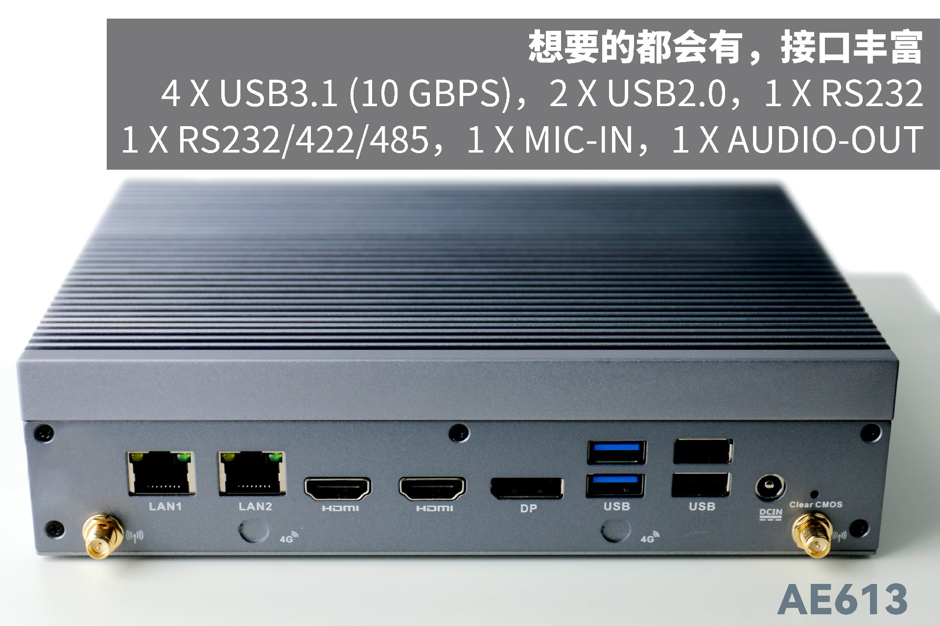 k8凯发AE613支持Windows 11 、Linux Ubuntu系统;拥有丰富接口:双千兆自适应RJ45网口,4 x USB3.1 (10 Gbps),2 x USB2.0,1 x RS232,1 x RS232/422/485,1 x MIC-IN,1 x AUDIO-OUT,帮助用户实现更多功能扩展;并且支持Wi-Fi 6E,可以提供更高的带宽和更少的干扰,支持对无线网络有特定需求场景的应用。