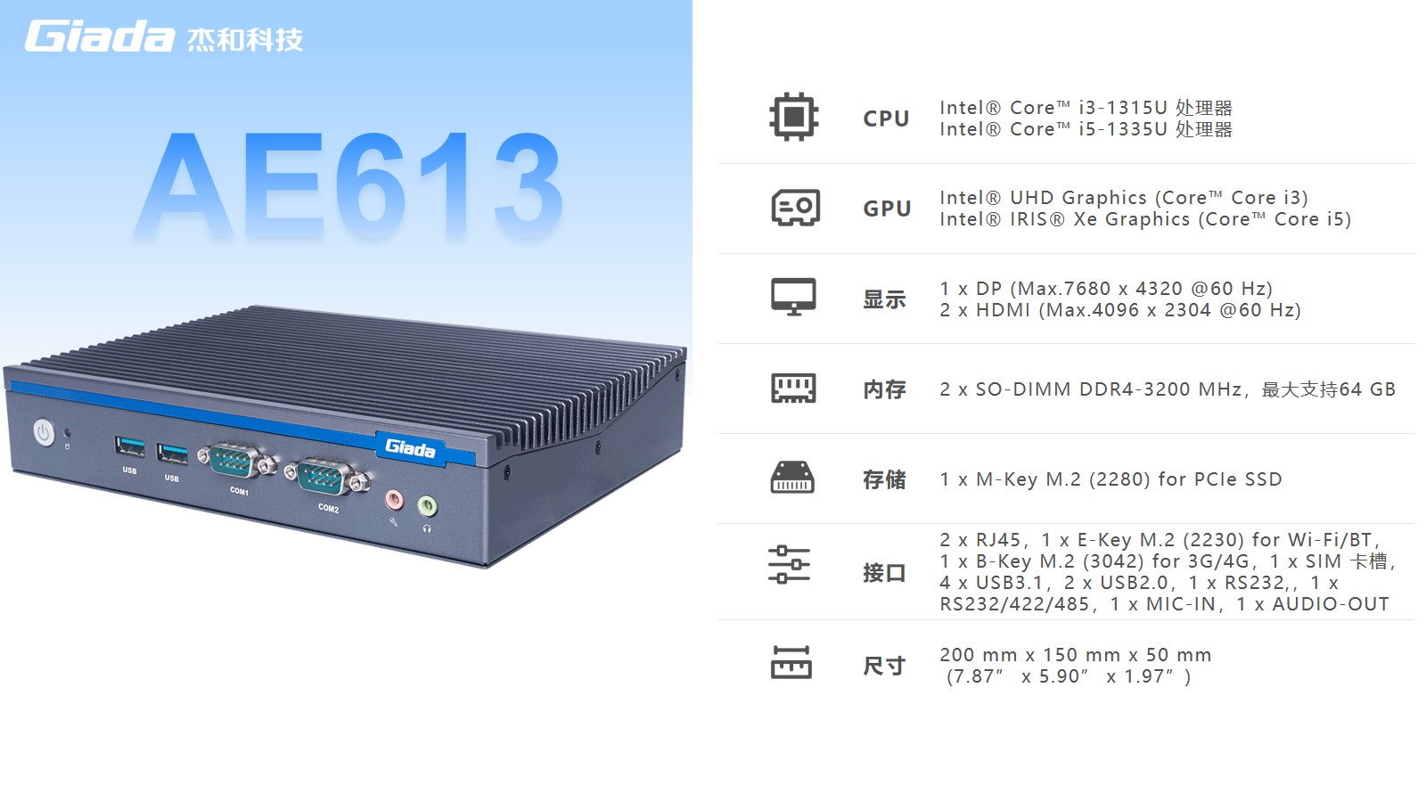 k8凯发AE613拥有2 x SO-DIMM DDR4-3200 MHz内存、1 x M-Key M.2 (2280) for PCIe SSD存储,最大支持64GB,无论是处理复杂的多任务环境、还是运行高负载的软件都游刃有余。