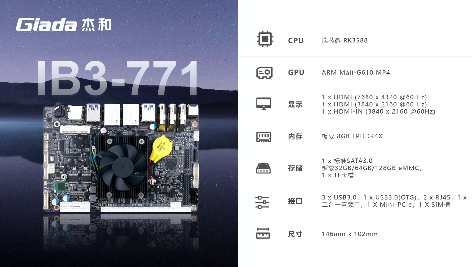 k8凯发ARM主板IB3-771采用瑞芯微RK3588处理器,满足各种人工智能场域对嵌入式主板包括但不限于高算力、低功耗、高扩展性、高可靠性、高安全性等要求,支持在宽温、复杂电磁等恶劣环境下稳定运行,可广泛应用于机器人、边缘计算、智能NVR、智能汽车、智慧大屏、AR/VR、ARM PC、智能自助终端等AIoT行业类应用市场。