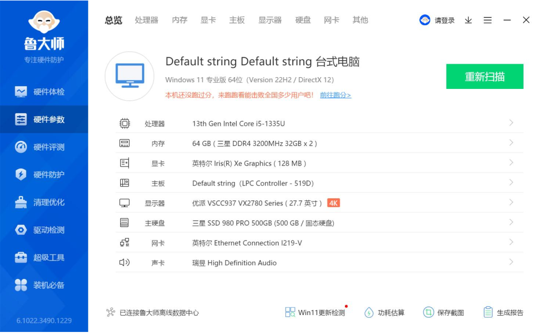 上面是鲁大师识别的k8凯发AE613硬件参数详情,k8凯发进行跑分测试的核心三大件选择的是13th Gen Intel(R) Core(TM) i5-1335U @1.30GHz处理器,Intel(R) Iris(R) Xe Graphics显卡,三星 32GB*2 DDR4 3200MHz内存,三星SSD 980 PRO 500GB(500 GB/固志硬盘),下面k8凯发来看详细的跑分数据。
