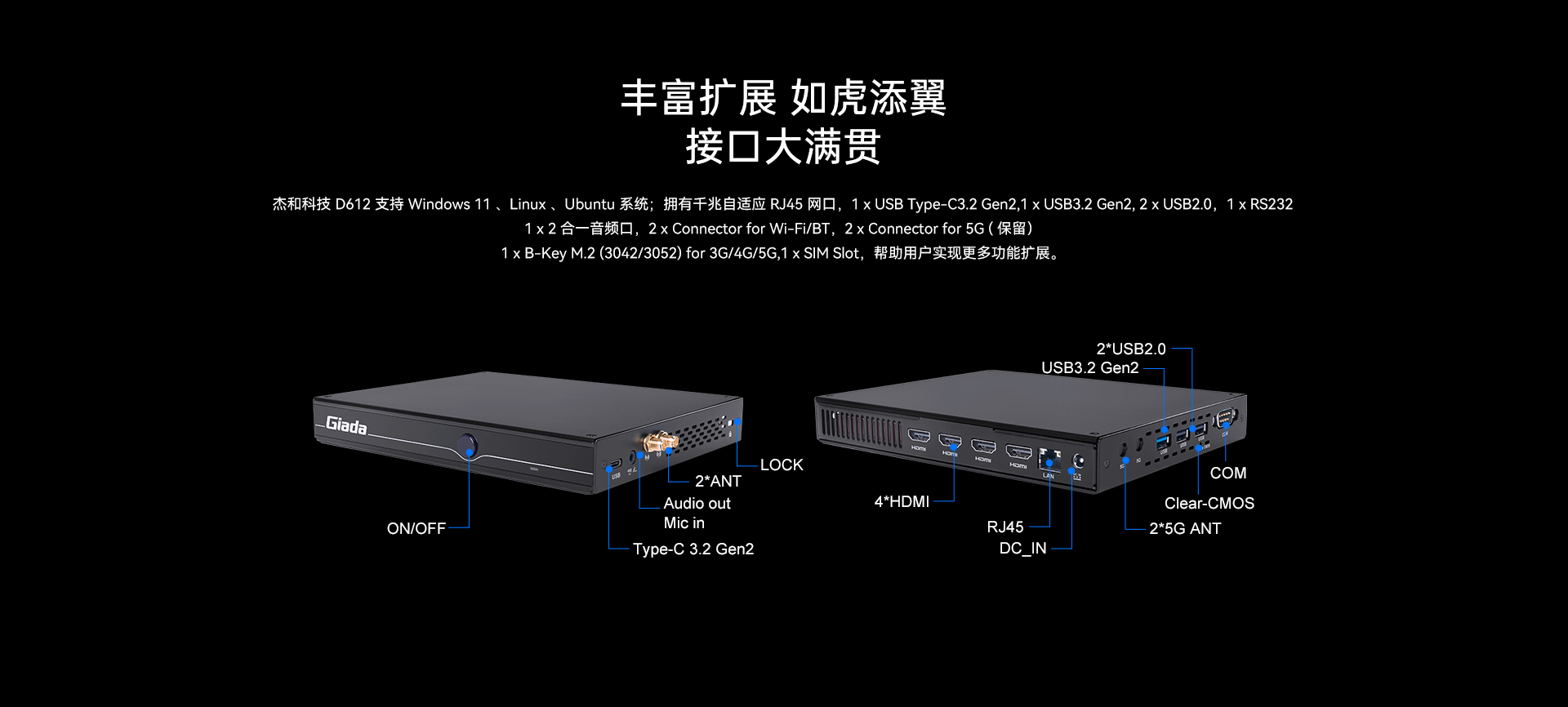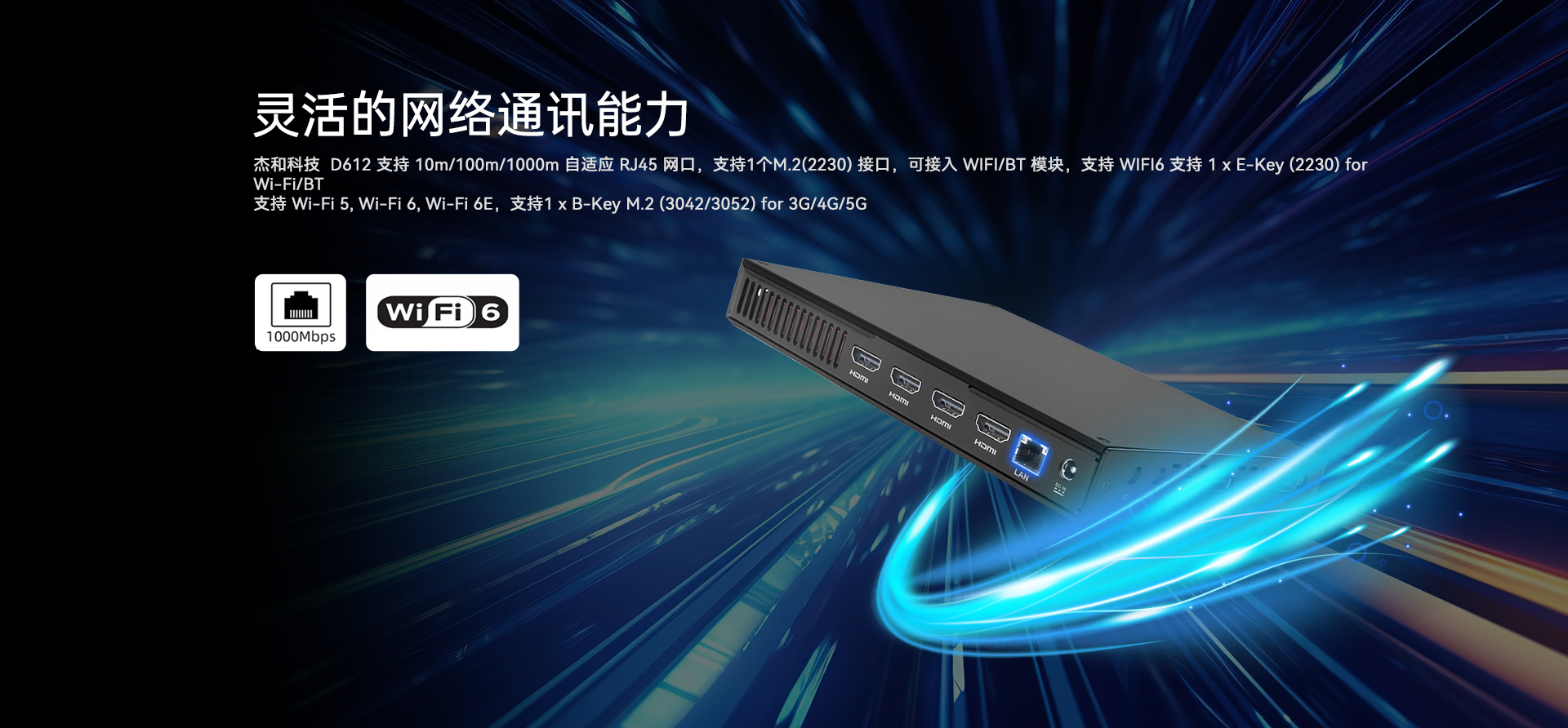 支持1x RJ45,1 x E-Key (2230) for Wi-Fi/BT(支持 Wi-Fi 5/6/6E (CNVi))