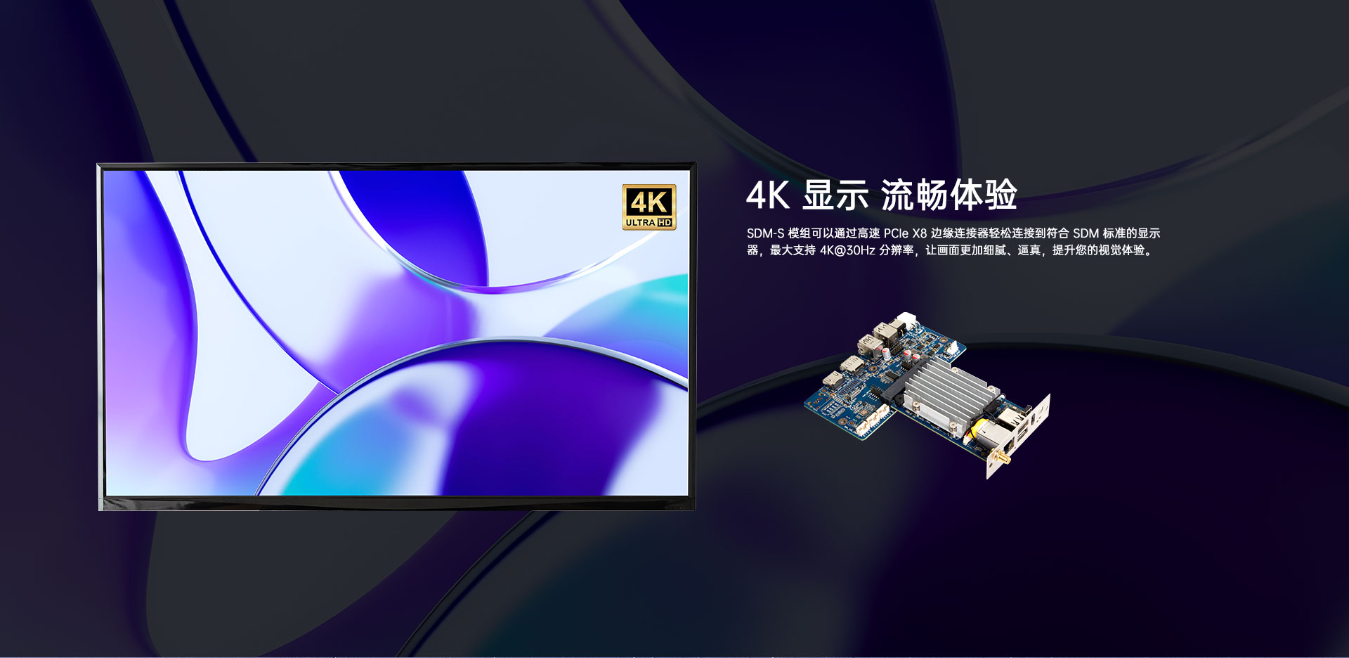 PCIE x8 EdgeConnector支持 1 x HDMI,1 x DP输出